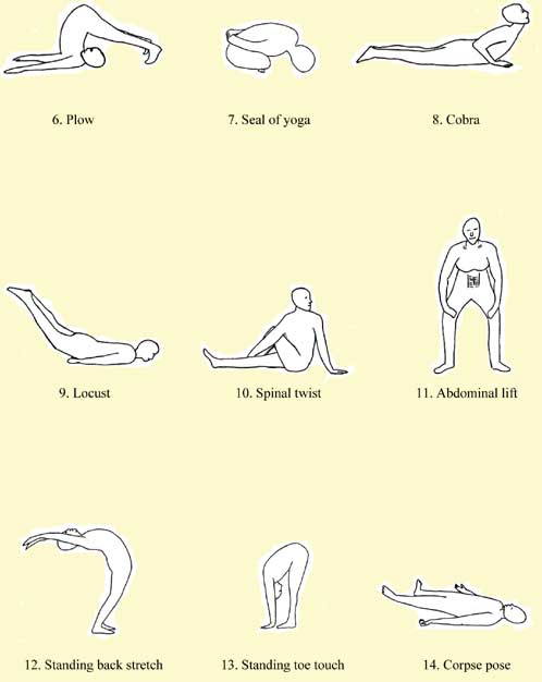 graphische Übersicht der mit 14 Hatha-Yoga-Positionen finden Sie hier.