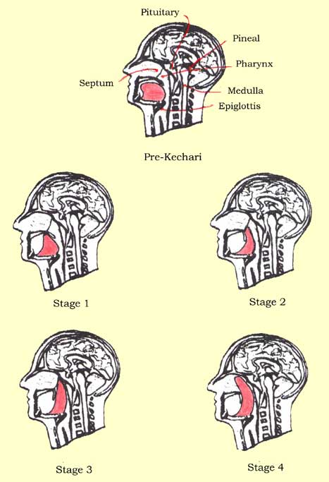 Image -- Kechari Mudra Stages 1 - 4 (Sketches by Yogani -- 11/17/04) See Lesson #108 for detailed discussion